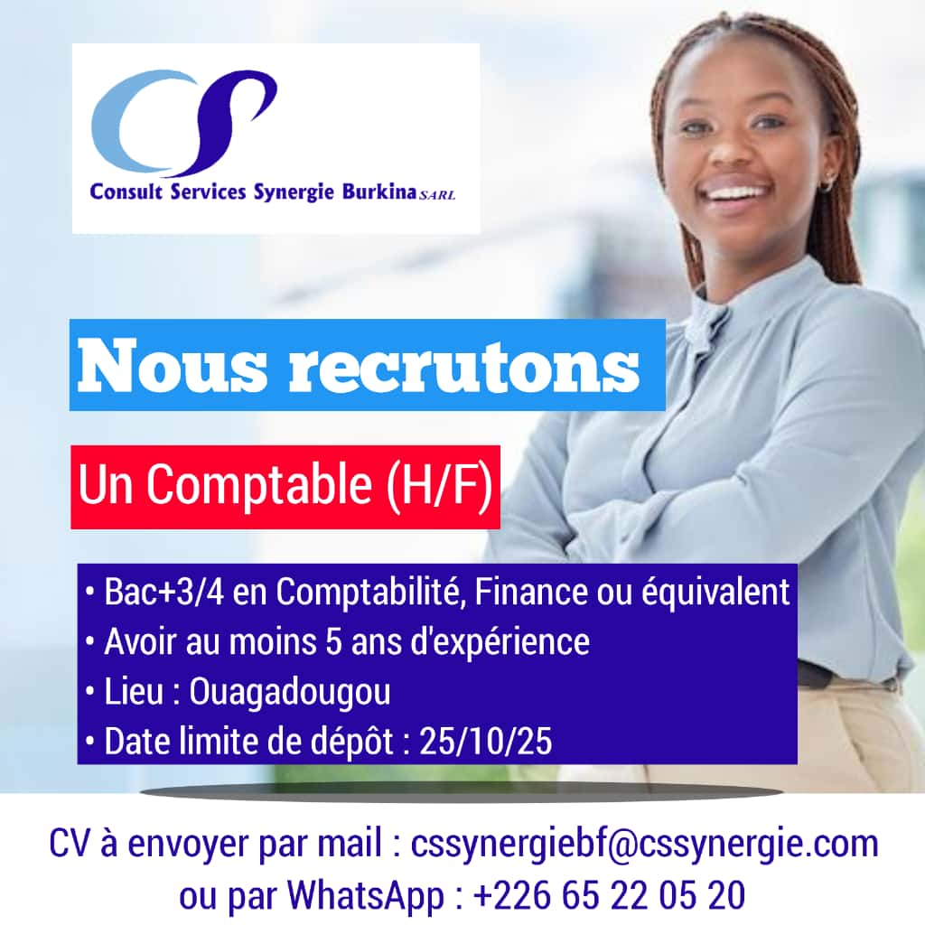 Consult Services Synergie, cabinet spécialisé en Stratégie, Organisation et Conseil en Ressources Humaines recrute pour l’un de ses partenaires, un (01) Comptable (H/F).