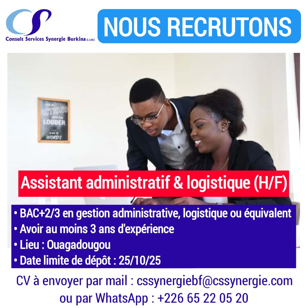 Consult Services Synergie, cabinet spécialisé en Stratégie, Organisation et Conseil en Ressources Humaines recrute pour l’un de ses partenaires, un (01) Assistant Administratif & Logistique (H/F)