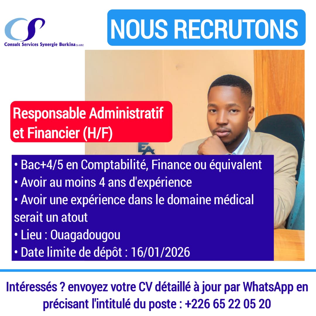 Les candidats intéressés sont invités à envoyer leur CV détaillé, à jour, daté et signé, en fichier PDF nommé : « Nom_Prénom_Responsable Administratif et Financier » à l’adresse suivante : cssynergiebf@cssynergie.com ou par WhatsApp : +226 65 22 05 20